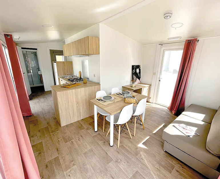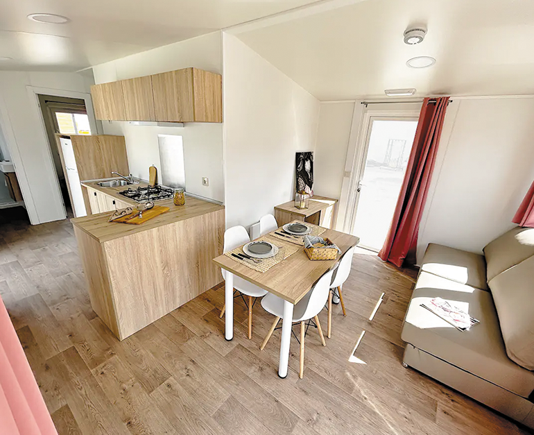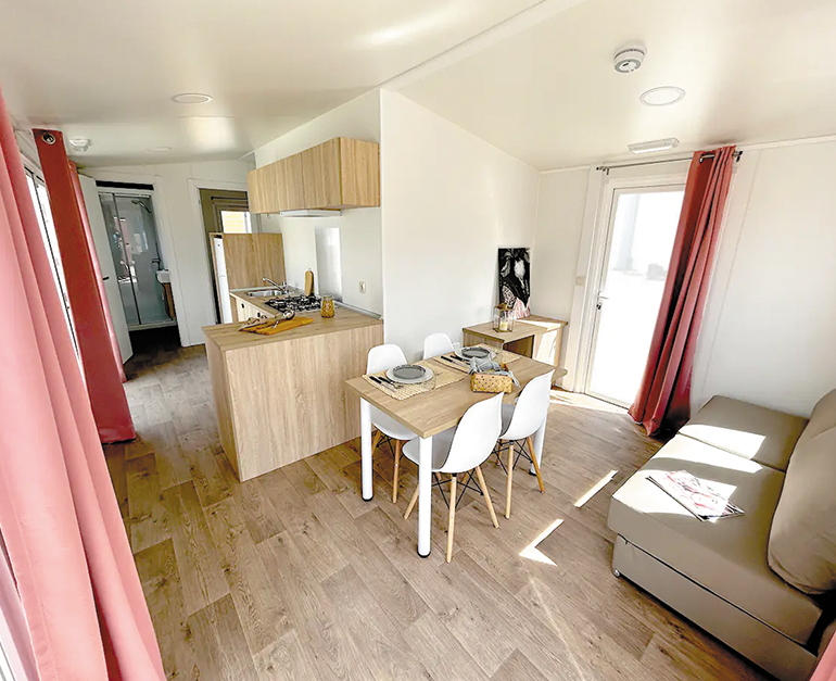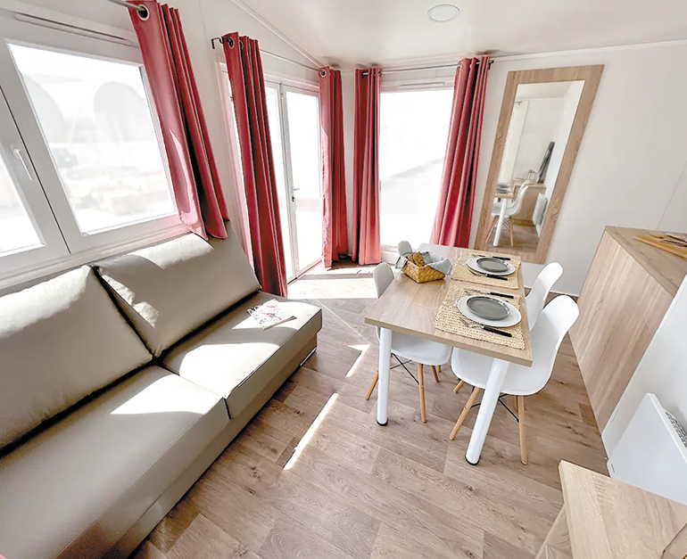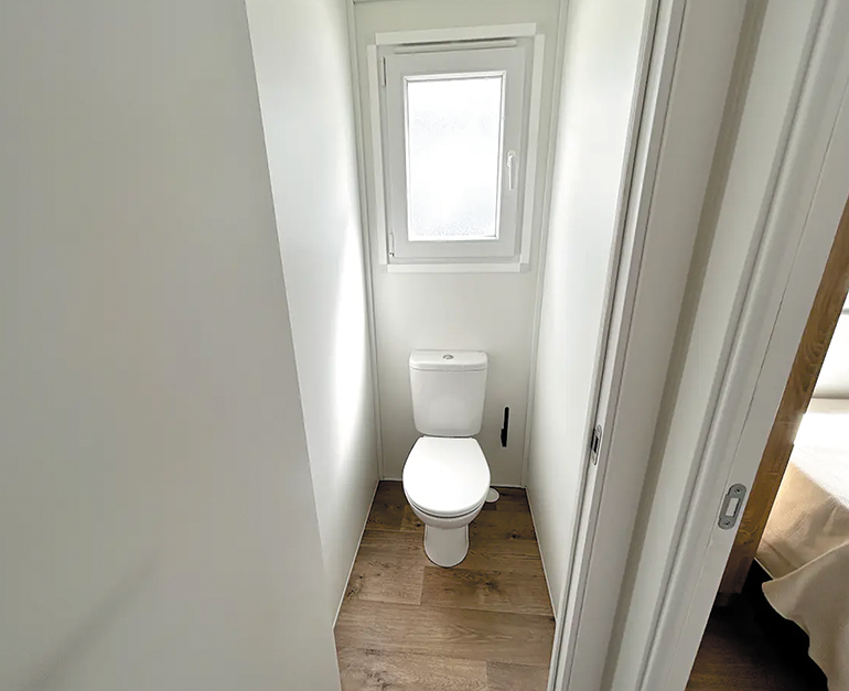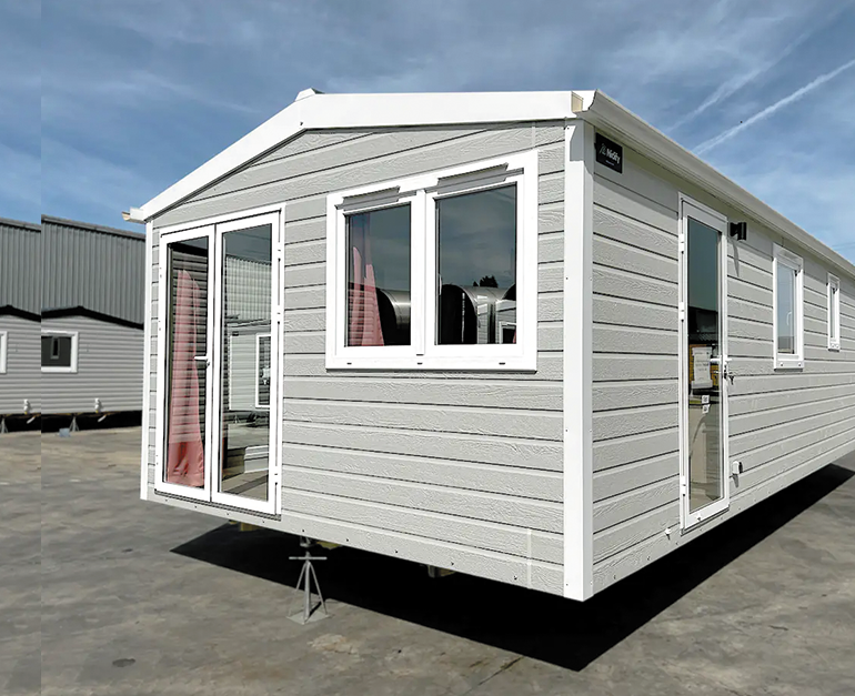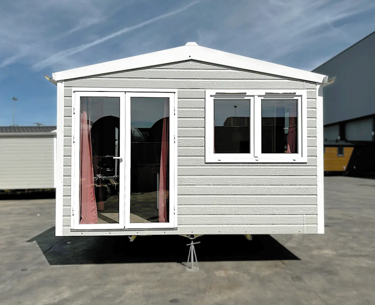 Nueva casa móvil expuesta en NIDIFY con acabado exterior Gris Canexel y carpintería exterior de PVC blanco. Acabado interior natural con cubierta a dos aguas.