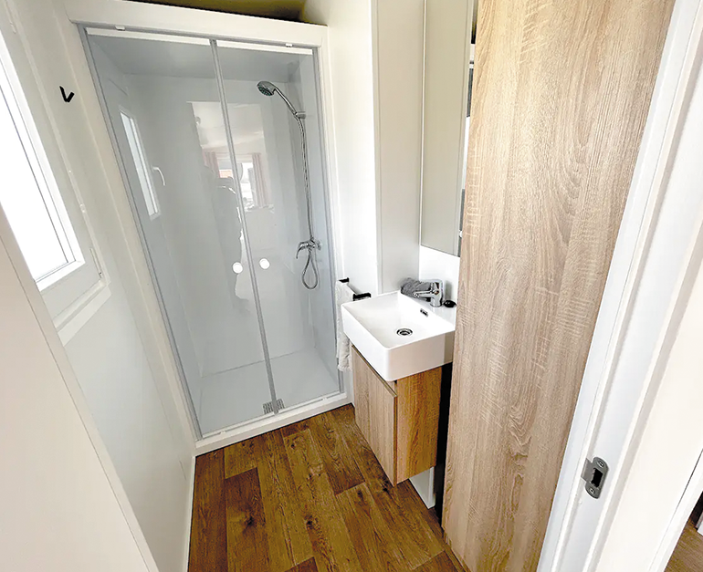 El baño está equipado con inodoro, lavabo y ducha con mampara.